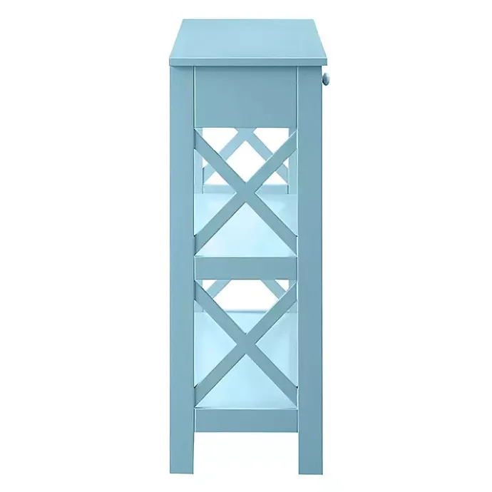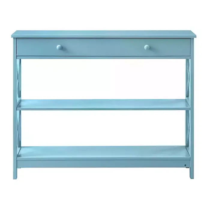 The modern, angular design of this Light Blue X-Frame 2-Shelf Console Table is give your space a fresh update. Featuring clean lines and plenty room for display and storage, it will perfectly complete any room!