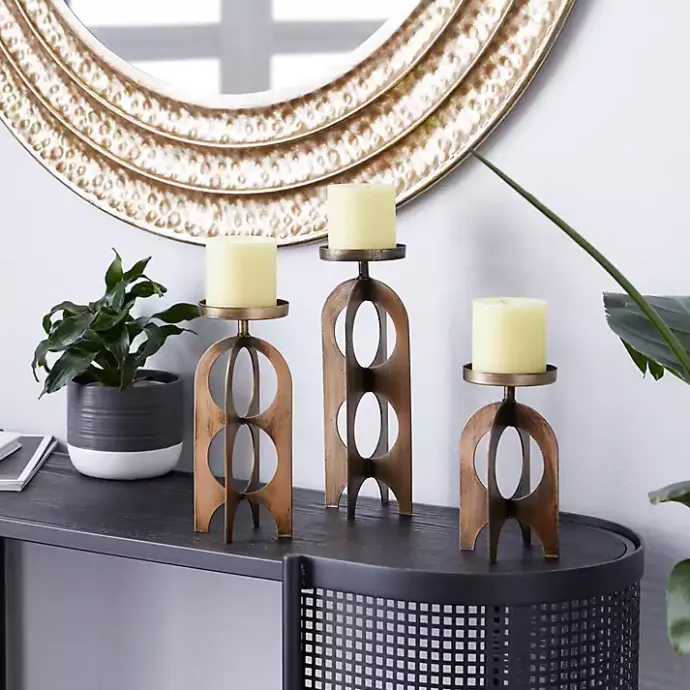 Our set of Gold Metal Cutout Candle Holders is where mid-century modern and contemporary meet. Its four legs and round hole cutouts suit any eclectic space.