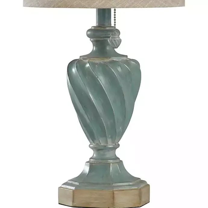 Catch the wave of this unique coastal design! Our Ocean Blue and Gold Table Lamp features a swirl, shell-shaped bodice with a match pull chain and sand-colored shade.