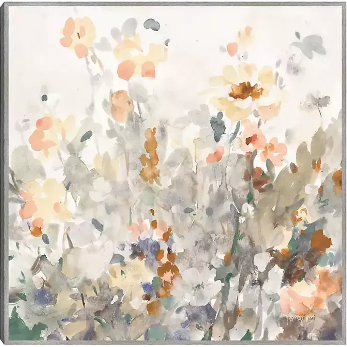 The October Garden Framed Canvas Art Print features a delicate blend of watercolor flowers with hints of peach and orange hues that add a warm, autumnal touch!