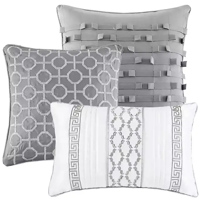 - Set includes one (1) comforter, one (1) bedskirt, two (2) shams, and three (3) pillows