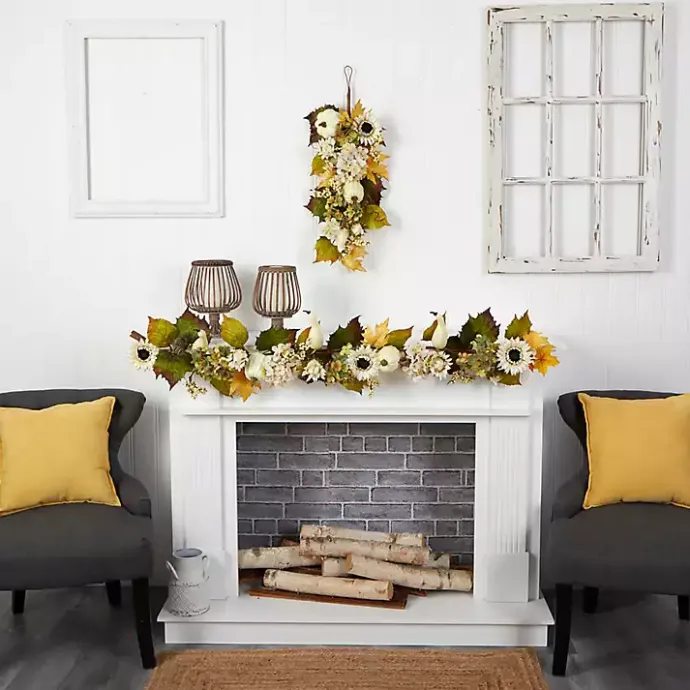 Transition your floral decor from summer to fall with the Sunflowers, Hydrangeas, and Pumpkins Garland! The lush foliage and bright flowers will look beautiful on your mantel.