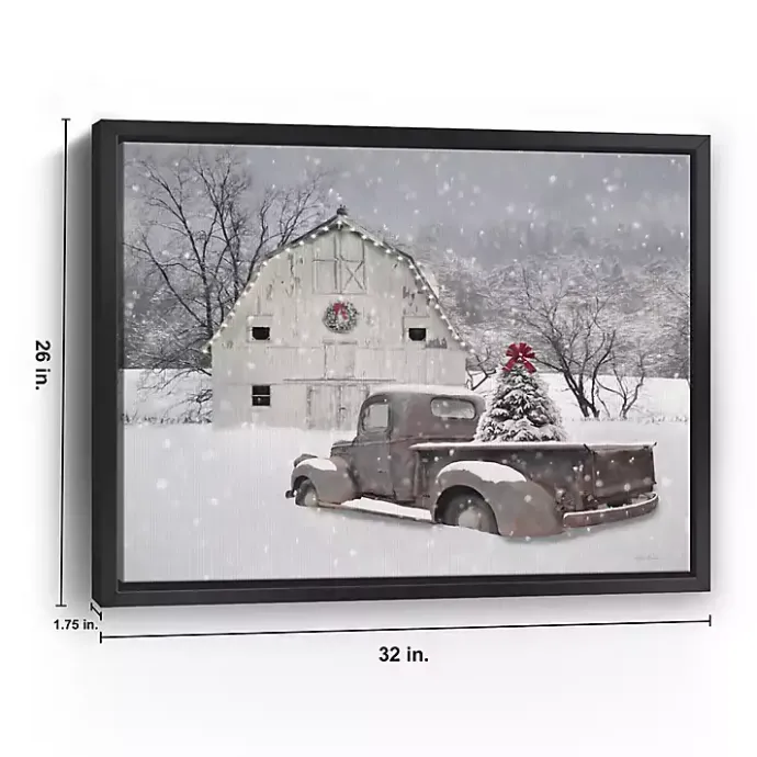 - Features a white, snow-covered barn and a vintage truck with a pine tree in the bed