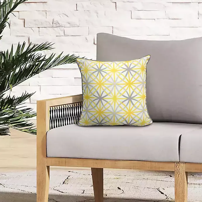 Add color and pattern to your porch or patio with this Yellow & Gray Geometric Flowers Outdoor Pillow! The pop of yellow and flower pattern will bring style and comfort all summer!